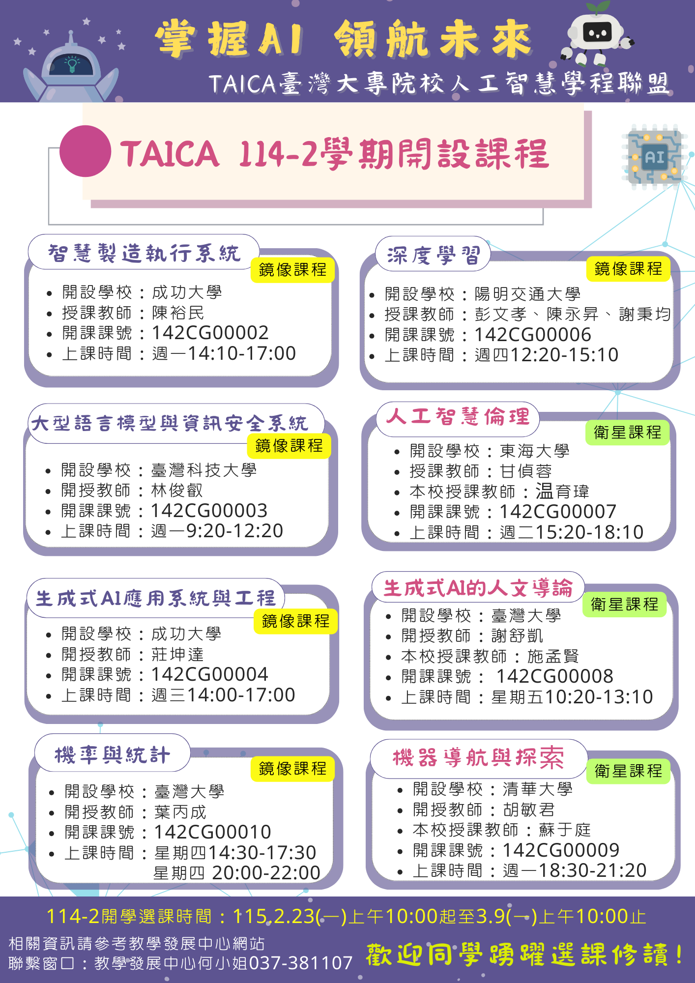 本校已加入教育部「臺灣大專院校人工智慧學程聯盟(TAICA)」,TAICA開設「人工智慧探索應用學分學程」、「人工智慧工業應用學分學程」、「人工智慧自然語言技術學分學程」及「人工智慧視覺技術應用學分學程」等 4 類學分學程,以提供不同領域學生的學習需求。