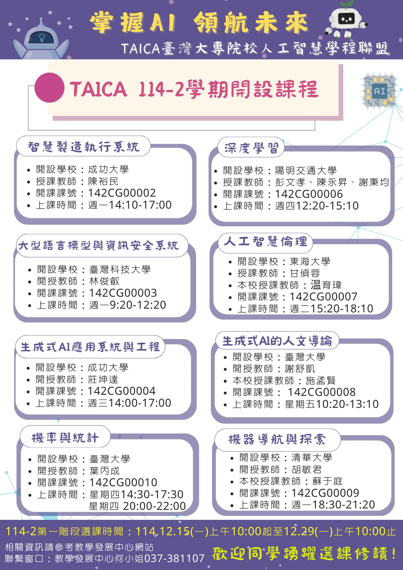 114-2開設課程資訊如下,人工智慧倫理課程時間調整為【每週二下午15:20-18:10】,目前選課系統時間【每週三】為誤植,請留意!!!!