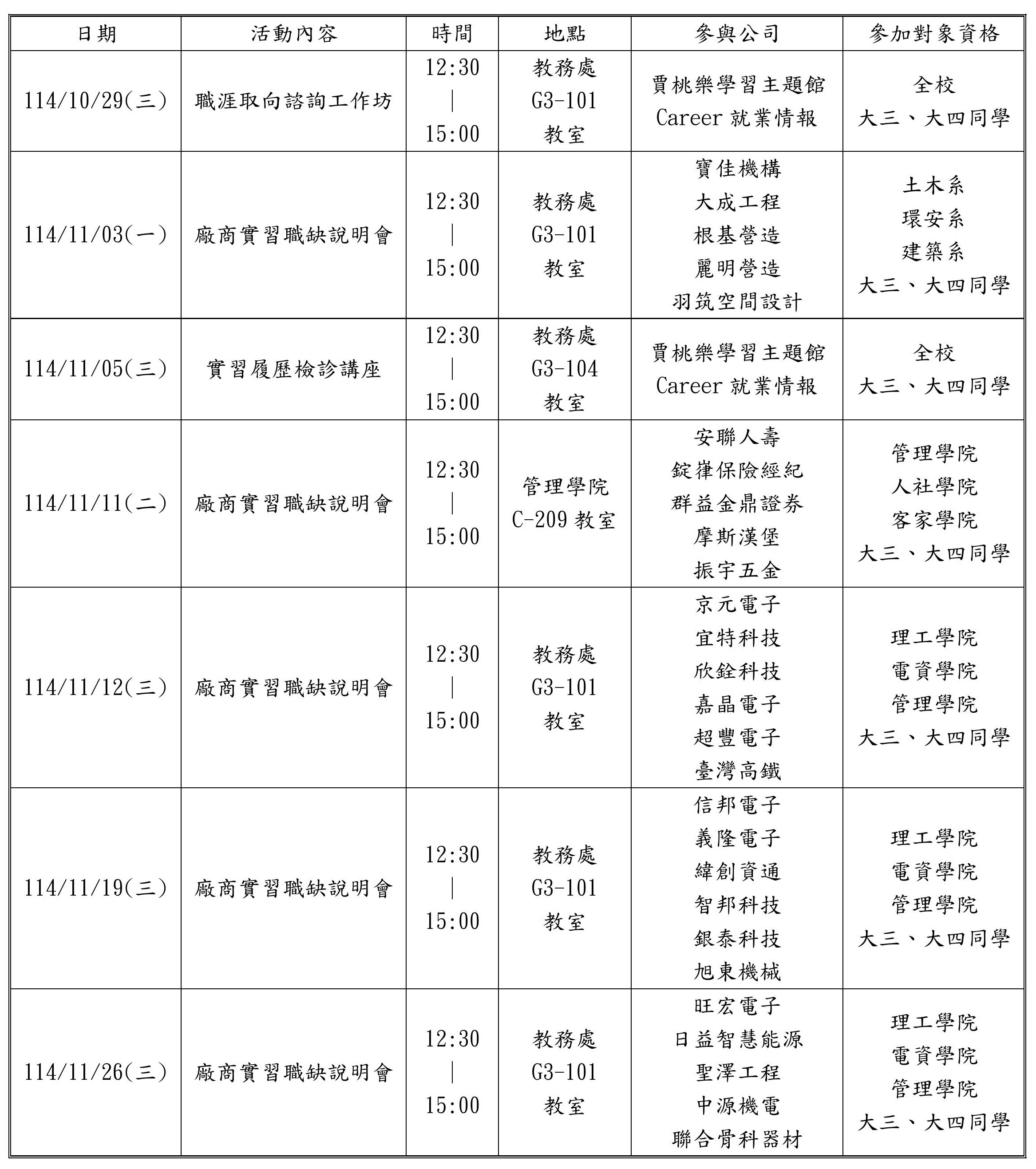 教學發展中心將於 10 月底 起舉辦一系列 校外實習相關活動,內容詳見下表。